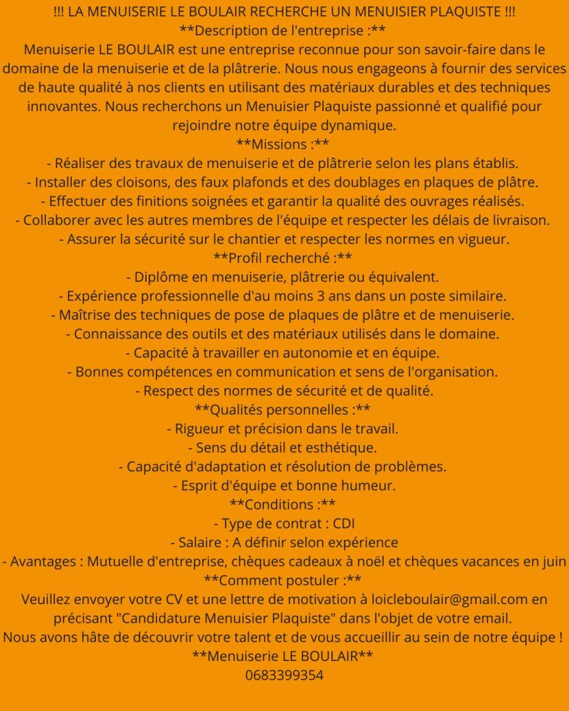 martine AGAG Concevoir le tracé , puis réaliser la pose d'une terrasse de 200 M2 en lames et lambourdes de bois exotiques faites pour défier le temps durant plusieurs décennies , c'est un investissement important et coûteux que nous avons fait le choix difficile de confier à Loïc Le Boulair et son équipe . Jour après jour , durant près de trois semaines , nous avons vu s'édifier notre terrasse sur des centaines de solives soigneusement ajustées au sol ainsi que sur tous les bords des parois murales . Le résultat est exceptionnel et tout à fait à la mesure de nos attentes , tant sur le plan esthétique que fonctionnel . Le label Artisan Métiers d'Art dont se prévaut l'entreprise est ainsi amplement justifié ; chapeau bas l'artiste ! SYLVAIN ROTTIER Placo, portail en bois, clôture en bois, verrière pour cuisine, carport en 2021, très bon travail, et SAV réactif. En aout 2024 j'ai à nouveau fait appel à M. Le Boulair, cette fois-ci pour remplacer des menuiseries sur une maison ancienne. Très bon travail, et livré dans les temps, je recommande. Analog Teknomobile Nous sommes très satisfaits de la prestation et du tarif. Une entreprise sérieuse et vivement recommandée. severinne Professionnel et réactif Nous a changé une porte d entrée ainsi qu un double vitrage en une demie journée pour un bon rapport qualité/ prix. Thaïs Troubnikoff J ai fait appel à l entreprise le boulair pour la rénovation d appartement, ouvertures volets électriques et travaux de menuiserie pour la cinquième fois et toujours aussi satisfait du travail réalisé et du professionnalisme de l entreprise. Les devis sont raisonnables et justes , il n y a pas de surprise à l arrivée. Je conseille sans hésiter cette entreprise qui représente la qualité de l artisanat en France . Stephane Macrez Artisan sérieux compétent et réactif ayant changé deux ouvertures dans un appartement aux sables d olonne en respectant le devis établi Je conseille sans réserves . eric deligny Super travail satisfait de la pose de mes fenêtres et de la Creation d’une terrasse en bois Professionnel réactif du patron aux ouvriers très contentieux dans leur travail. Je recommande cette artisan. Merci encore pour votretravail Sabrina Gallet Entreprise sérieuse , qui a su répondre à mes besoins pour la construction de ma maison , garage en bois ,charpente, pose d ouverture et placo. Merci a vous GuiSteph CZYZ Réalisation d'une terrasse en bois composite de 100m2. Très professionnel et très appliqué. Très bon relationnel. Je recommande.